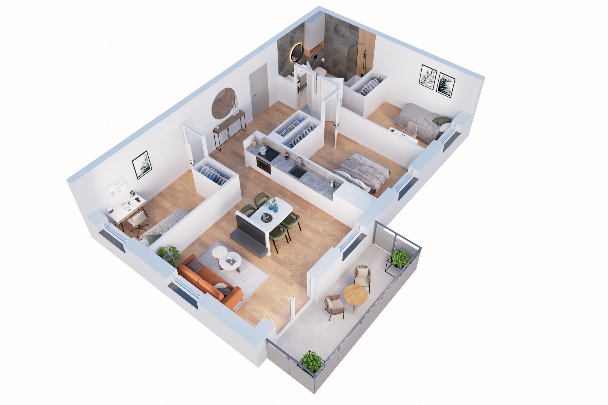 sypialnia oraz dwa pokoje tworzą wygodną, harmonijną przestrzeń do życia i wypoczynku.